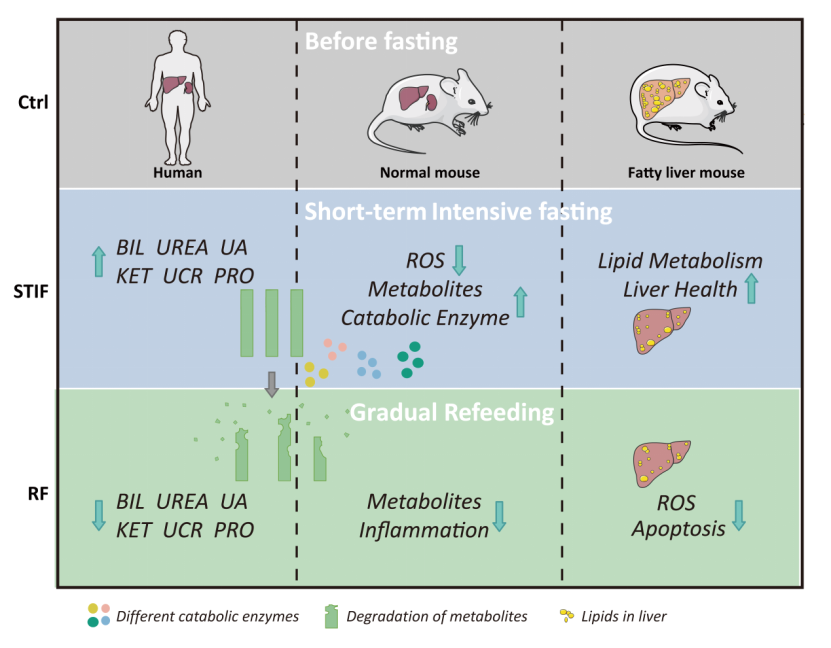 Results: Clinically significant metabolites of fat and protein were found to accumulate during the fasting phase, but they were relieved after gradual refeeding. Metabolomics profiling revealed a universal pattern in the consumption of metabolic intermediates, in which pyruvate and succinate are the two key metabolites during STIF. In the STIF mouse model, the accumulation of metabolites was mostly counteracted by the upregulation of catabolic enzymes in the liver, which was validated in a human cell model. Kidney filtration function was partially affected by STIF but could be recovered by refeeding. STIF also reduced oxidative and inflammatory levels in the liver and kidney. Moreover, STIF improved lipid metabolism in mice with fatty liver without causing accumulation of metabolites after STIF.