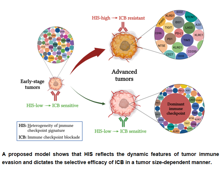 During early tumorigenesis, immune checkpoints are usually expressed at relatively low levels (HIS-low), thus sensitive to ICB therapy. Following tumor progression, the tumor microenvironment (TME) becomes increasingly immune suppressive to evade host immunosurveillance. This process involves two potential mechanisms: a stochastic upregulation of multiple immune checkpoints, leading to HIS-high and resistance to ICB therapy (Majority), or a selective overexpression of a few pivotal immune checkpoints while maintaining others at lower levels (Minority). Therefore, the elevated expression of key immune checkpoints reduces the HIS in large tumors compared to small tumors, rendering those large tumors sensitive to blocking the predominant immunosuppressive signal in the TME.
