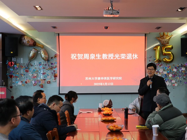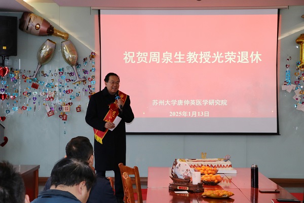 1月13日上午,唐仲英医学研究院举行了以“退休不褪色 余热亦生辉”为主题的周泉生教授荣休仪式。出席本次活动的有唐仲英医学研究院党委书记孙庆民、副院长(主持工作)戴克胜、唐院行政人员、教师和学生代表,仪式由办公室主任高峰青主持。