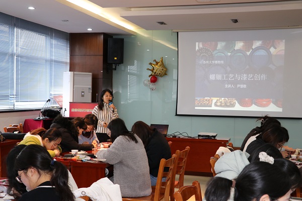 随后,来自博物馆的尹慧敬老师为大家带来了精彩的螺钿技艺讲解。螺钿,是一种将贝壳母贝等材料镶嵌在器物表面的传统装饰工艺,历史悠久,技艺精湛,被誉为“东方艺术明珠”。尹老师从美学的角度对螺钿工艺文化背景、技艺特点以及螺钿在中国传统工艺漆艺中的应用等方面进行了深入浅出的讲解,并现场展示了部分成品工艺品,大家赞叹不已,跃跃欲试。