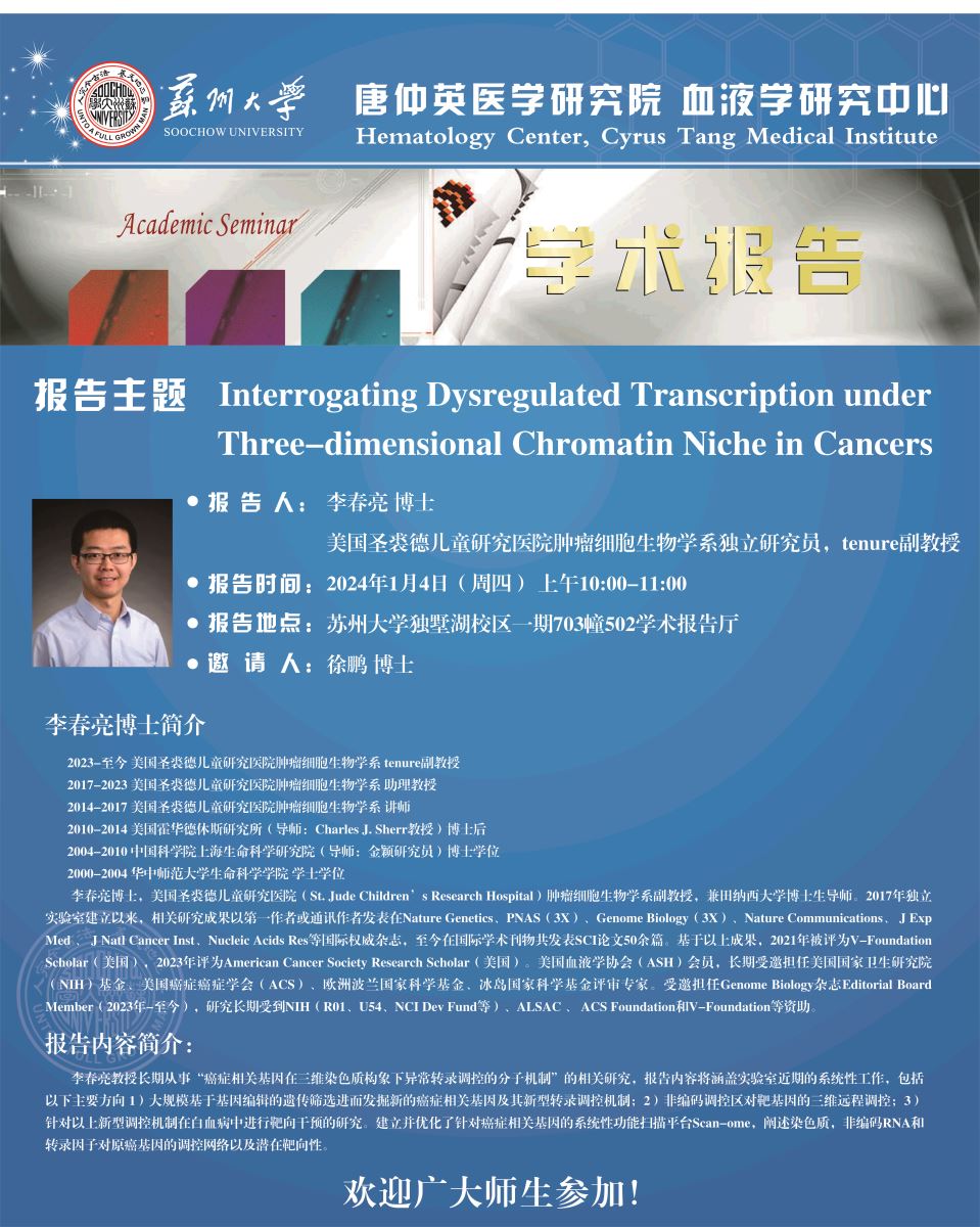 2024年1月4日美国圣裘德儿童研究医院李春亮研究员学术报告